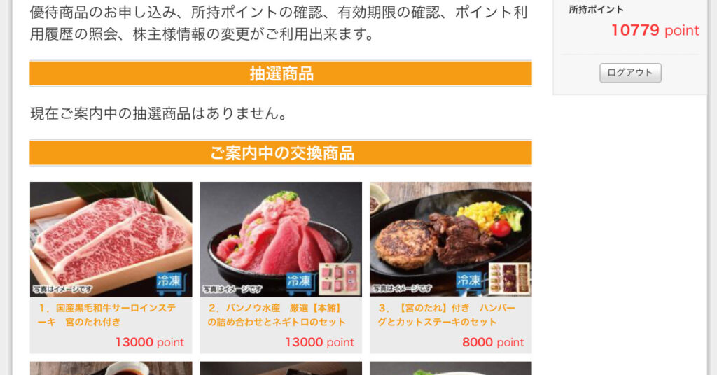 アトムから優待カードにポイントが加算されました。1000株2名義保有、10000×2=20000ポイント。年2回優待でありがたいです。ステーキ宮の持ち帰りに使うことが多いです。