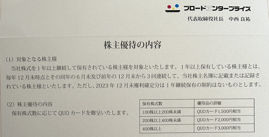 ブロードエンタープライズよりクオカードが届きました。400株保有で3000円のが届きました。クオカードは本の購入に使っています。