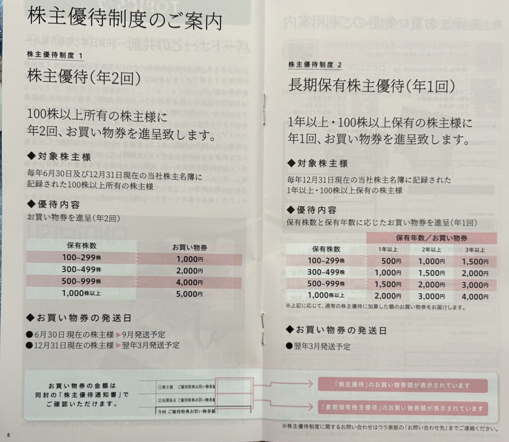 | 100株 | 1000円(1年以上+500円、2年以上+1000円、3年以上+1500円) |