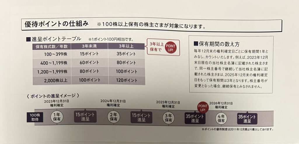 | 100株 | 15ポイント(1500円分) |