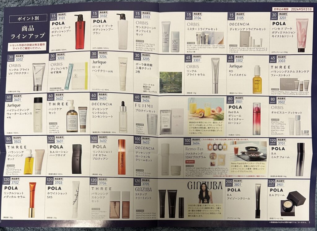 ポーラオルビスHDよりカタログが届きました。800株保有しているので60ポイント=6000円分です。前回の分のポイントも繰り越しているので現在120ポイント12000円分。今回もポイントを繰り越ししようと思っています。