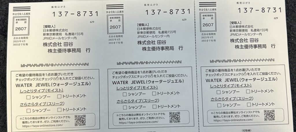 Posted in株主優待 田谷(4679) Posted by By manana 2024年7月25日No Comments 田谷より選んでいた商品が届きました。髪が長く傷みやすいのでトリートメント多めにしました。 年1回 利確月 3月 100株優待券3300円分500株優待券9900円分1000株優待券19800円分 manana View All Posts Post navigation Previous Post 伊藤園(2593)Next Postオリックス(8591)